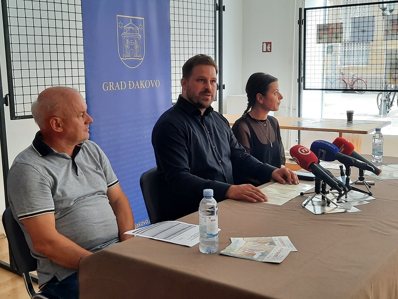 Marin Mandarić gradonačelnik Grada Đakova i predsjednik Organizacijskog odbora Đakovačkih vezova, Marija Burek, direktorica Turističke zajednice Grada Đakova i suorganizator Đakovačkih vezova i Tomislav Vuković, predsjednik Folklornog odbora Đakovačkih vezova predstavili su program 56. Đakovačkih vezova.
